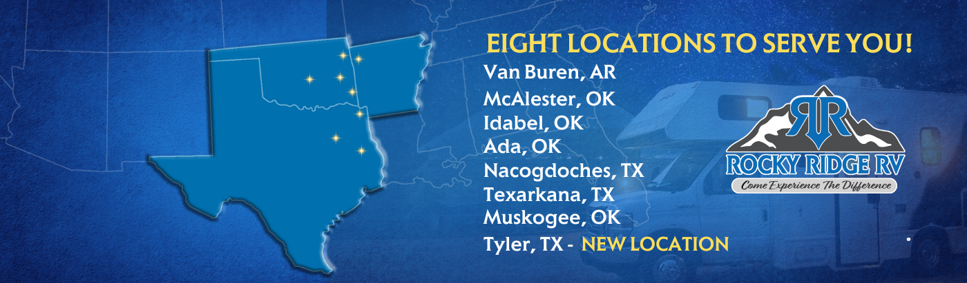 With dealerships NOW OPEN across Texas, Oklahoma, and Arkansas, including Texarkana, Nacogdoches, Idabel, Muskogee, McAlester, Van Buren, and our Powersports hub in Ada – we're closer than you think! Each location is fully equipped for all your needs: expert RV Sales, reliable RV Service, and a comprehensive selection of RV Parts.