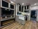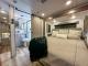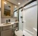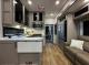 The residential living area is expansive, thanks to three slide-outs, offering a gourmet kitchen with a large island and a full-size 19 cu. ft. 12V refrigerator. The coach boasts one and a half bathrooms (including a half bath off the garage) for ultimate convenience. Up front, the private master suite features a residential King Bed.