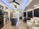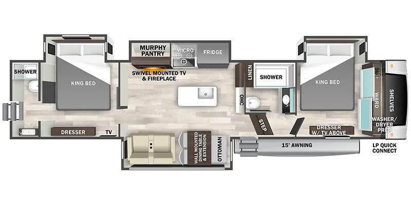 Inside, you'll find a well-appointed kitchen featuring a full-size refrigerator, three oven burners, and vinyl flooring. The master bedroom boasts two king-size beds, a full-size closet, mirror doors, and shades for privacy. Additionally, the 38DB includes two bathrooms with porcelain toilets and vinyl flooring, ensuring convenience for all travelers. With features like solar power prewiring, air conditioning, and a tankless water heater, this RV is ready to provide a comfortable and enjoyable travel experience for its occupants.