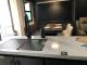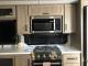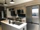 Large Island Kitchen: The kitchen includes a spacious island with a double sink, a large 12V residential refrigerator, a three-burner cooktop with an oven, and ample pantry space.