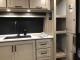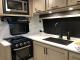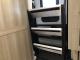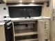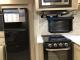 Coastal Kitchen: Front kitchen layout featuring a large window, solid surface countertops, a 12V refrigerator, and a 3-burner gas oven.