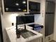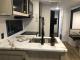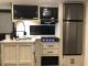 Chef’s Kitchen: Outfitted with a 10 cu. ft. 12V black glass refrigerator, a 3-burner cooktop with backlit knobs, a microwave, and a deep-basin farm-style sink.