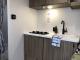 Appliances: Equipped with a 2-burner cooktop with a glass cover, a microwave, and a 12V high-efficiency refrigerator.