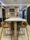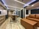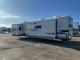 The expansive rear living area is dedicated to relaxation, featuring comfortable theater seating, a tri-fold sofa, and a large entertainment center with a cozy fireplace. The gourmet kitchen is a chef's dream, boasting a large center island, a free-standing dinette, and a spacious 10.7 cu. ft. 12V refrigerator. The raised front master suite features a slide-out with a King Bed, a full-width wardrobe with washer/dryer prep, and a private access bathroom.