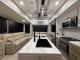 The residential-style kitchen is designed for serious cooking and entertaining, featuring a kitchen island with solid surface countertops, a large residential refrigerator, ample pantry storage, and a free-standing dinette. Outside, enjoy a power awning and exterior storage built for all your gear.