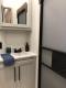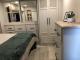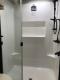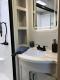 Full Bathroom: Features a one-piece fiberglass shower with a seat and residential-style medicine cabinet.